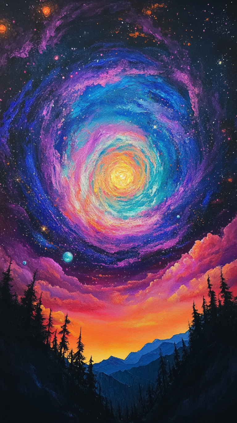 Colorful Swirling Galaxy Above Mountains And Trees
